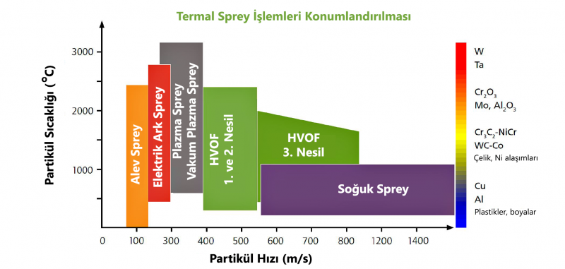 Tabloda görüldüğü üzere en yüksek hıza soğuk spreyde ulaşılırken, en yüksek proses sıcaklığına ise plazma sprey yöntemiyle ulaşılmaktadır. Şekilde kaplama yöntemlerinin altlık sıcaklığı ve kaplama kalınlığı açısından değerlendirilmesi gösterilmiştir.